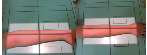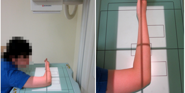 ② forearm을 중심 선에 놓고 medio lateral epicondyle를 연결한 선이 카세트면과 평행이 되도록 위치시킨다.